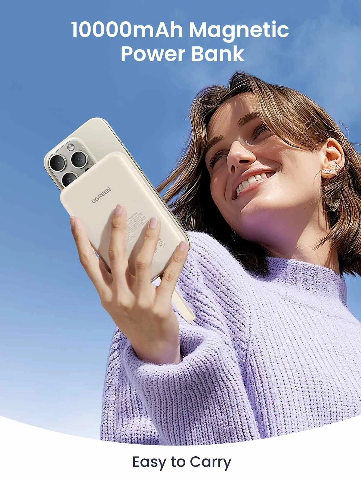Power up effortlessly with the UGREEN PB760 10,000mAh Magnetic Wireless Power Bank, designed for MagSafe-compatible smartphones. Featuring strong magnetic alignment for secure wireless charging, 20W fast wired output, and a slim, skin-friendly design, this power bank keeps your devices charged whether you’re working, traveling, or on the move.