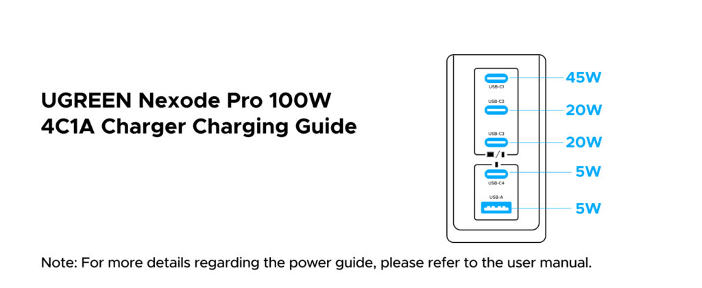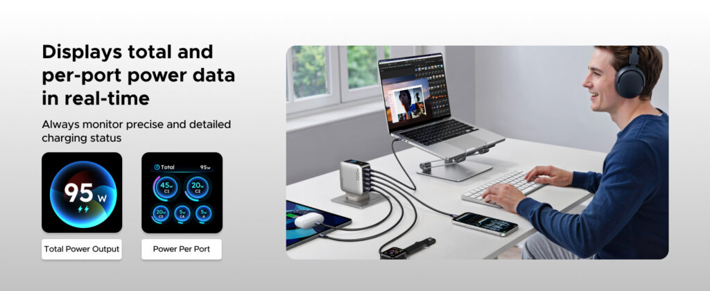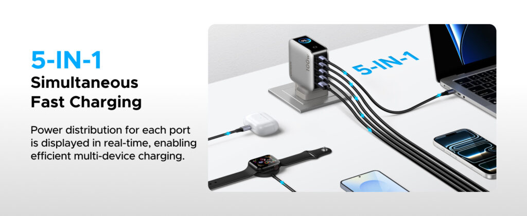 • 5-Port Charging – 4× USB-C + 1× USB-A for multiple devices