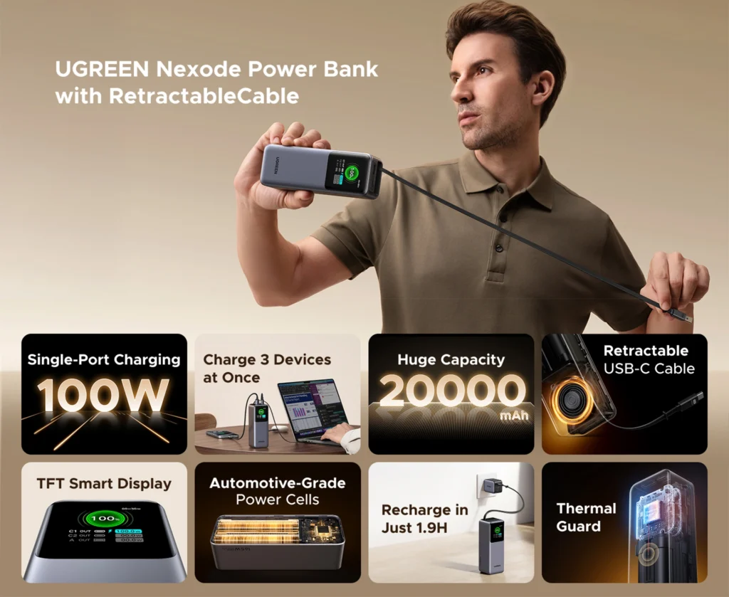 UGREEN 20000mAh 165W Power Bank with Retractable Cable – PB726 – 55987B – 1 Year Warranty