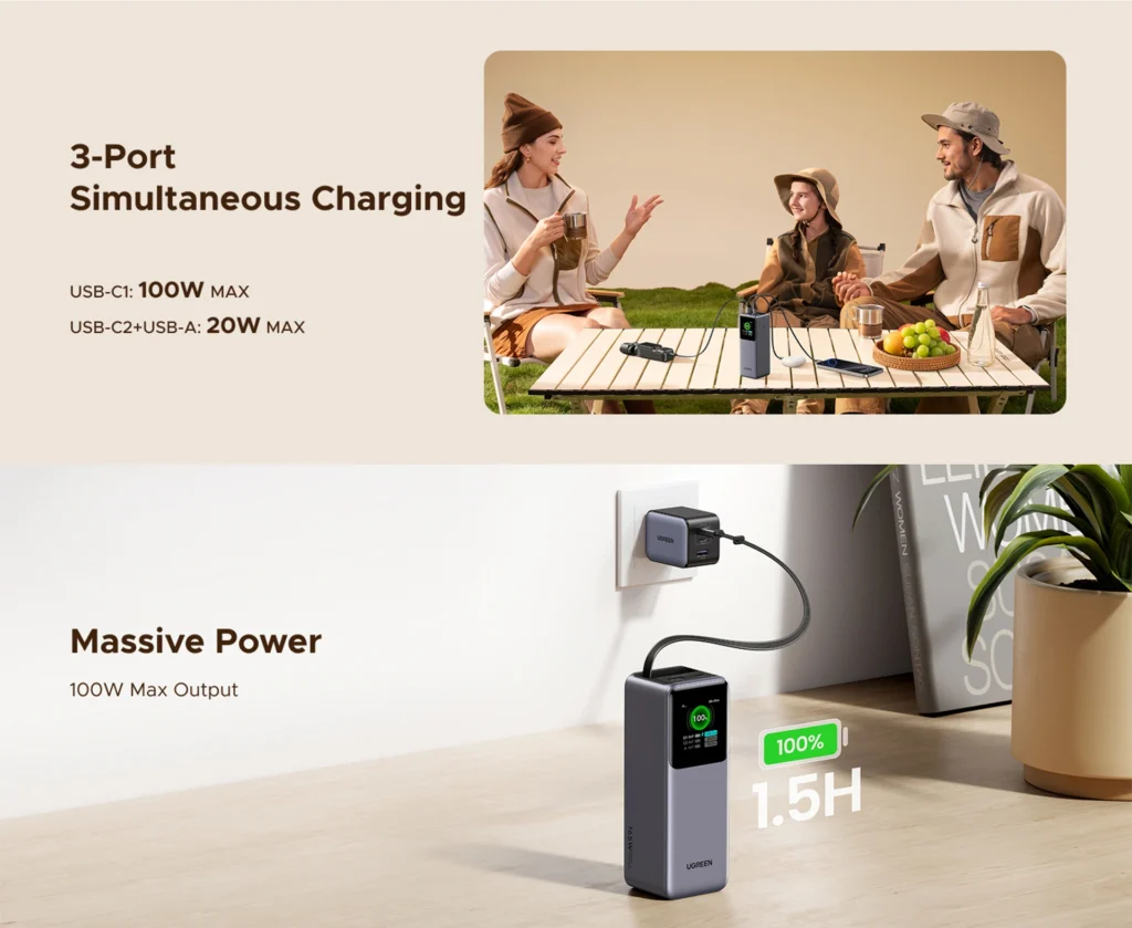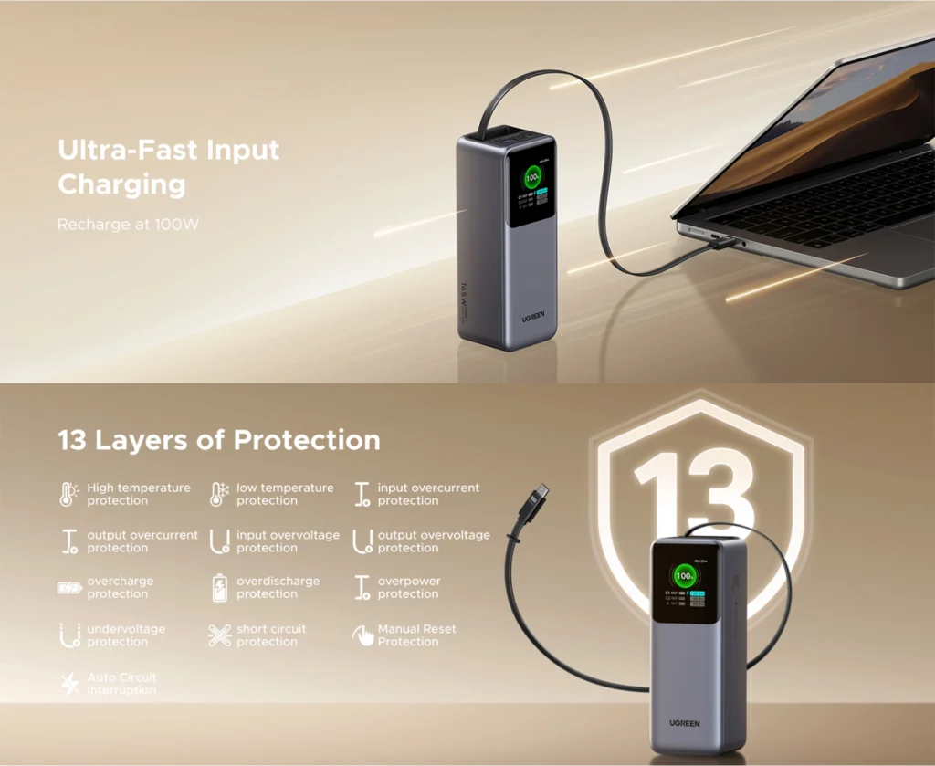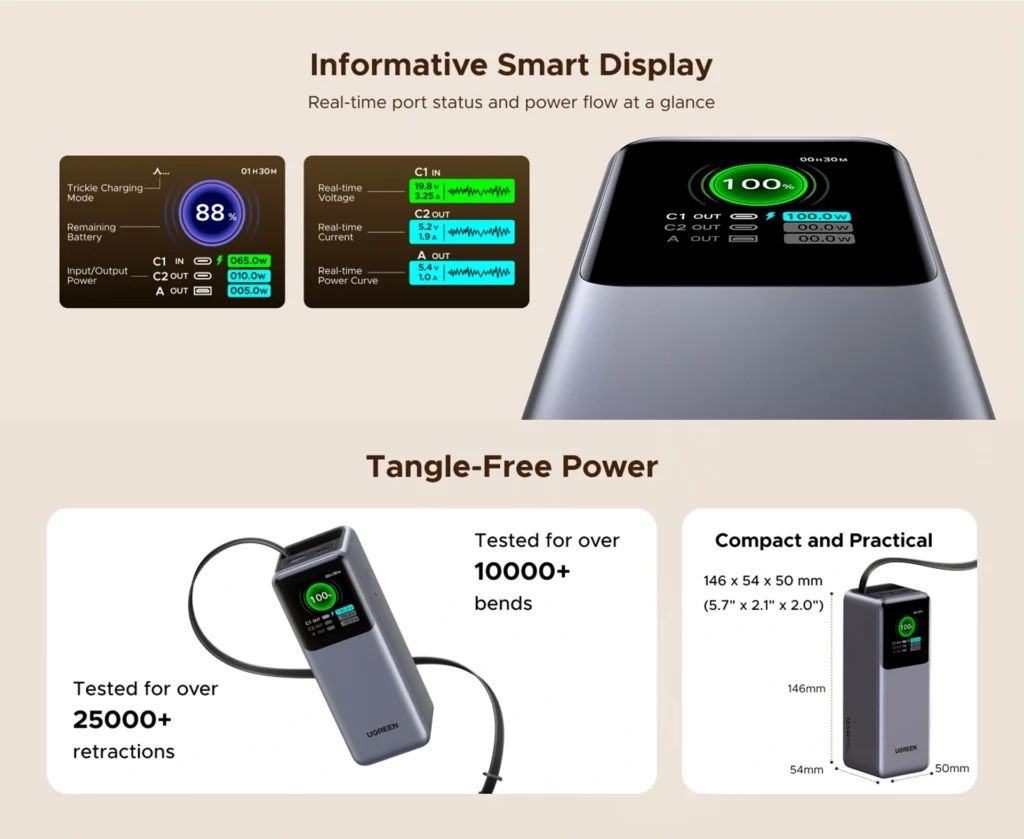 Stay powered up wherever you are with the UGREEN 20000mAh 165W Power Bank (PB726). Designed for laptops, tablets, smartphones, and other high-demand devices, this premium power bank combines a massive 165W output, built-in retractable USB-C cable, and smart digital display in a durable, travel-ready body.