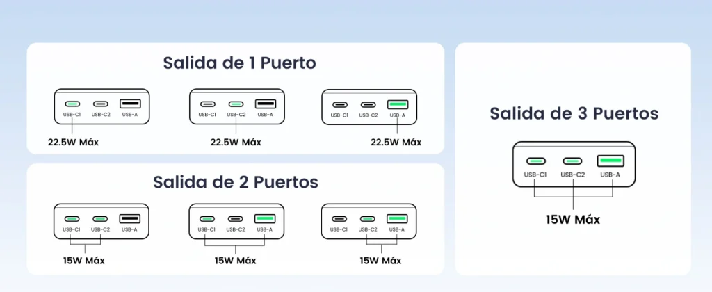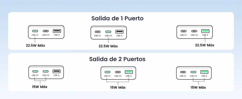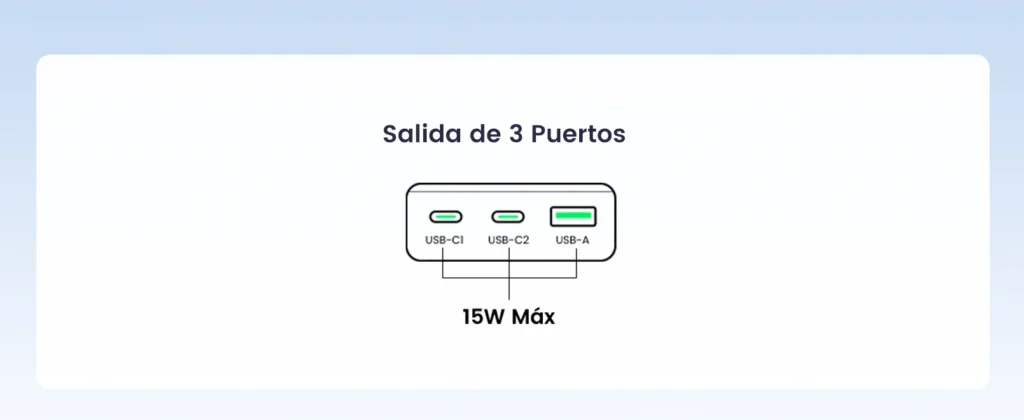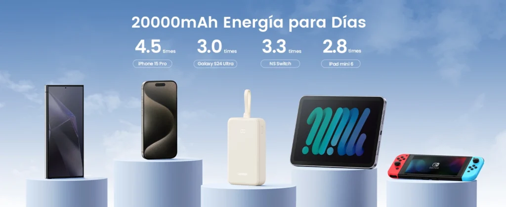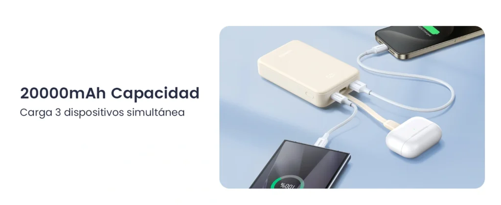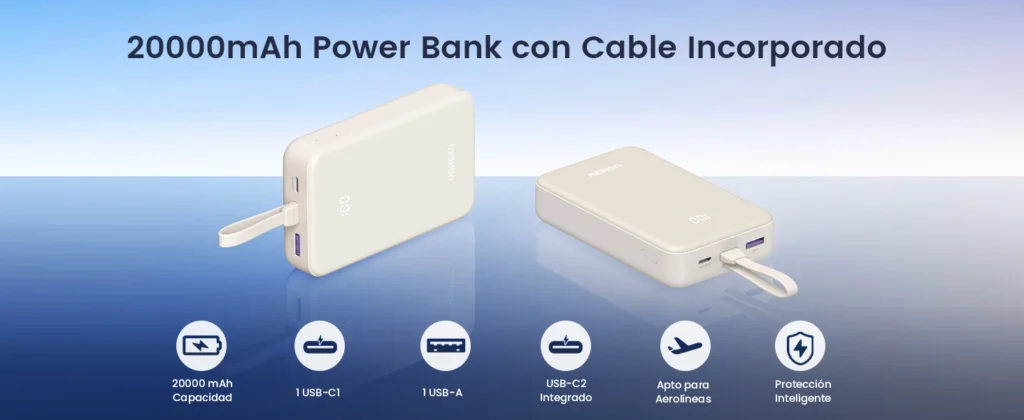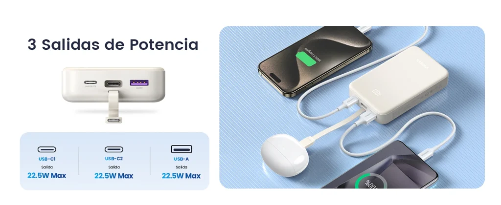 Supports 20W max output via USB-A, USB-C port, and the built-in USB-C cable. Compatible devices can reach up to 60% in about 30 minutes.