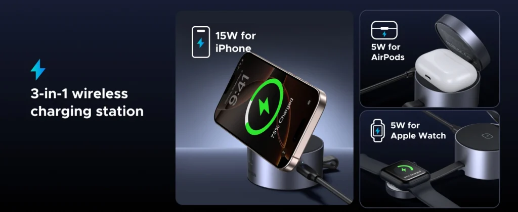 Simplify your charging setup with the UGREEN W712 3-in-1 Magnetic Wireless Charger. Designed for Apple users, this MagSafe-compatible charging station powers your iPhone, Apple Watch, and AirPods simultaneously—all from a single compact and foldable device.
