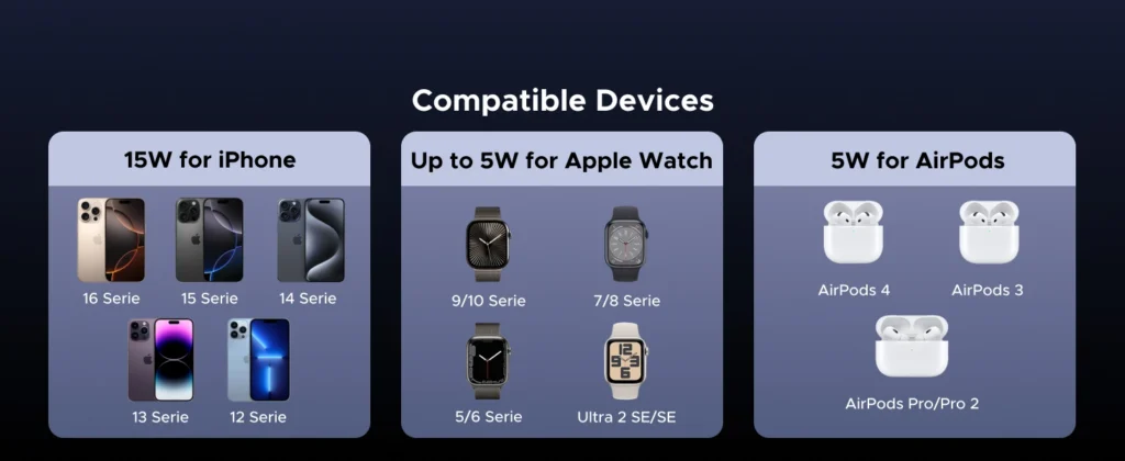 • 25W Total Wireless Charging – iPhone 15W, Apple Watch 5W, AirPods 5W