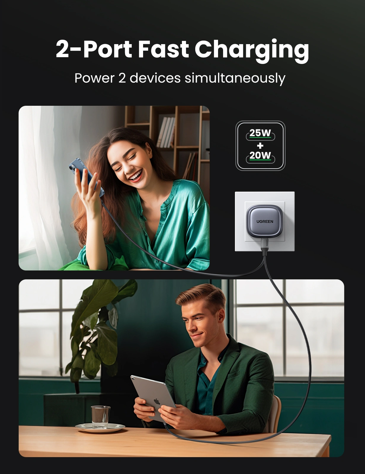 45W Dual USB-C Ports: Charge two devices simultaneously with 25W from Port 1 and 20W from Port 2.