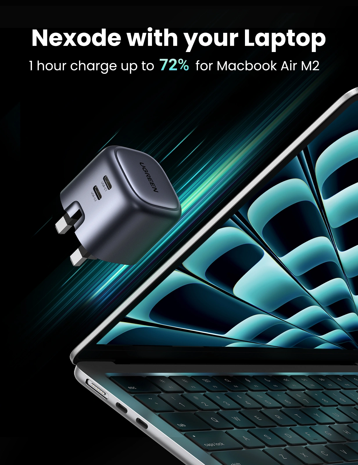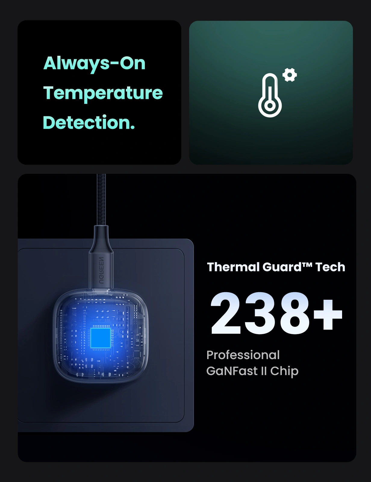 The UGREEN Nexode charger is equipped with Advanced Thermal Guard technology that monitors temperature in real-time, providing protection against overheating, over-voltage, and short circuits. This ensures the safety of both your charger and connected devices, giving you peace of mind while charging.